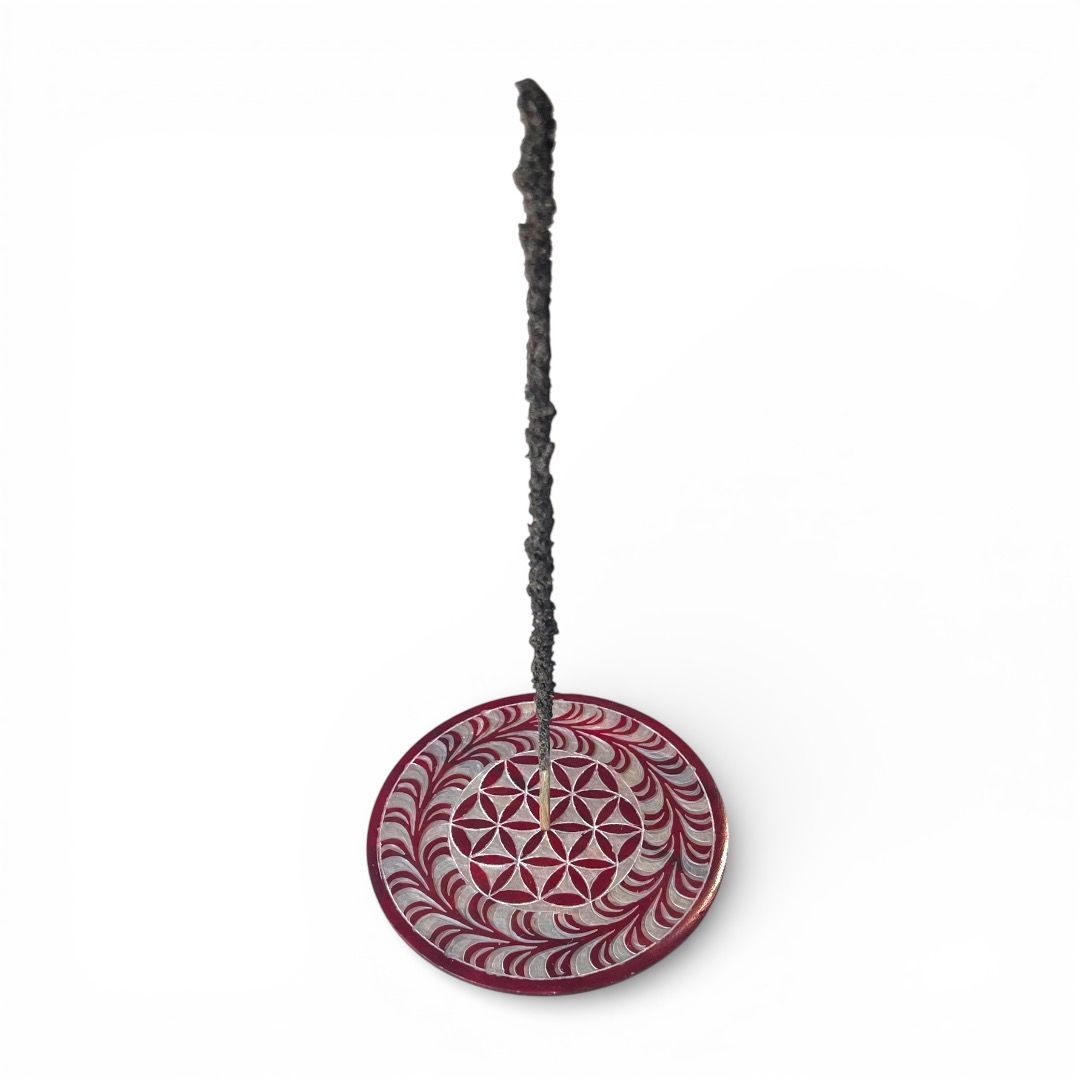 Realizzato artigianalmente in India, questo brucia incenso in pietra saponaria unisce bellezza e tradizione in un design semplice ma ricco di significato. La forma rotonda, in tonalità rosso con il Fiore della Vita inciso in bianco, crea un contrasto elegante e facilmente riconoscibile. Dotato di foro per bastoncini, può essere utilizzato anche con coni d’incenso, adattandosi a diverse esigenze. Ogni pezzo è scolpito a mano, rendendolo unico e ideale per creare un’atmosfera rilassante e armoniosa.