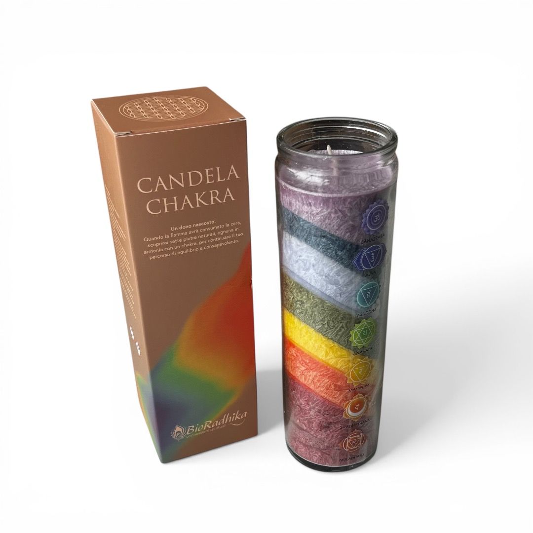 Candela esclusiva Bio Radhika in vaso di vetro, realizzata con cera di soia 100% naturale e caratterizzata da un design originale e ricco di dettagli. All’interno della candela sono presenti 7 pietre naturali, ciascuna associata a uno dei chakra, che emergono gradualmente durante la combustione, rendendo ogni utilizzo un’esperienza visiva e sensoriale unica.